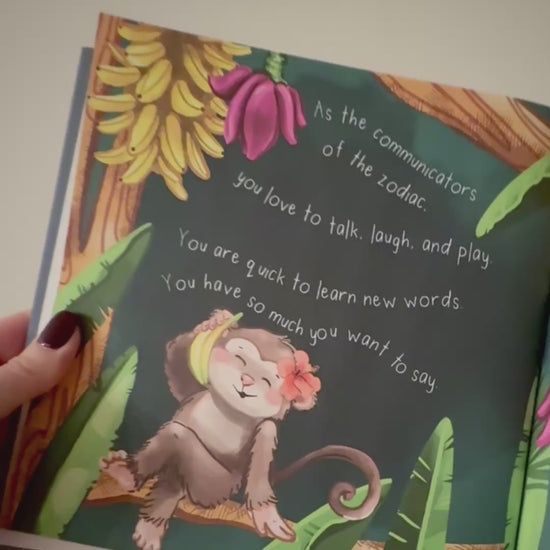 featuring twin monkeys, this astrology baby book takes you through the characteristics of a gemini baby.